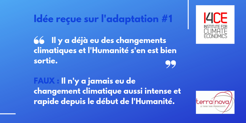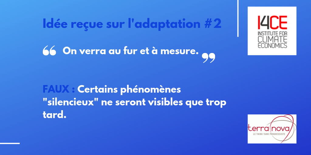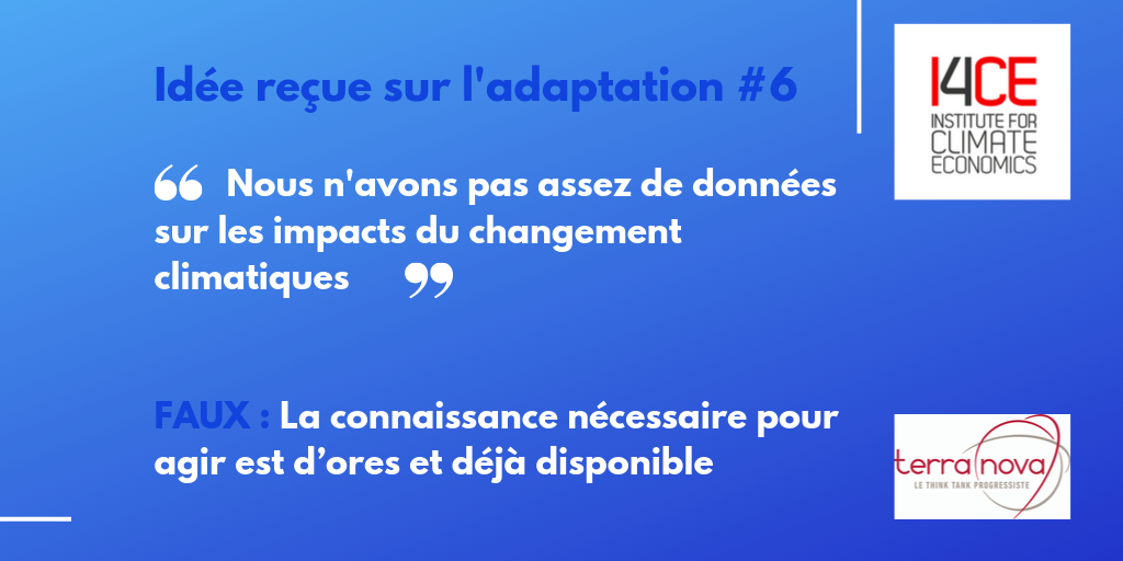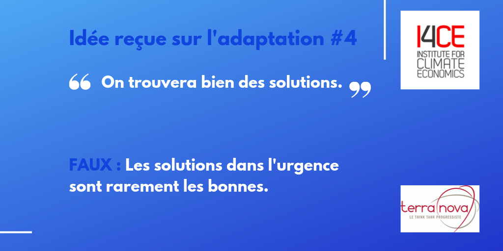 I4CE et Terra Nova viennent de publier 8 propositions d’actions politiques pour donner une impulsion à l’adaptation au changement climatique. Il est important d’agir dès maintenant car il serait une erreur de croire que nous pourrons agir au fil de l’eau. Vivian Dépoues d’I4CE et Antoine Guillou de Terra Nova nous présentent les 6 idées reçues les plus communément entendues.
