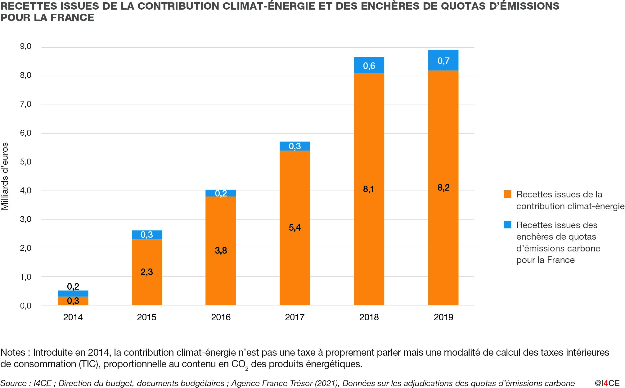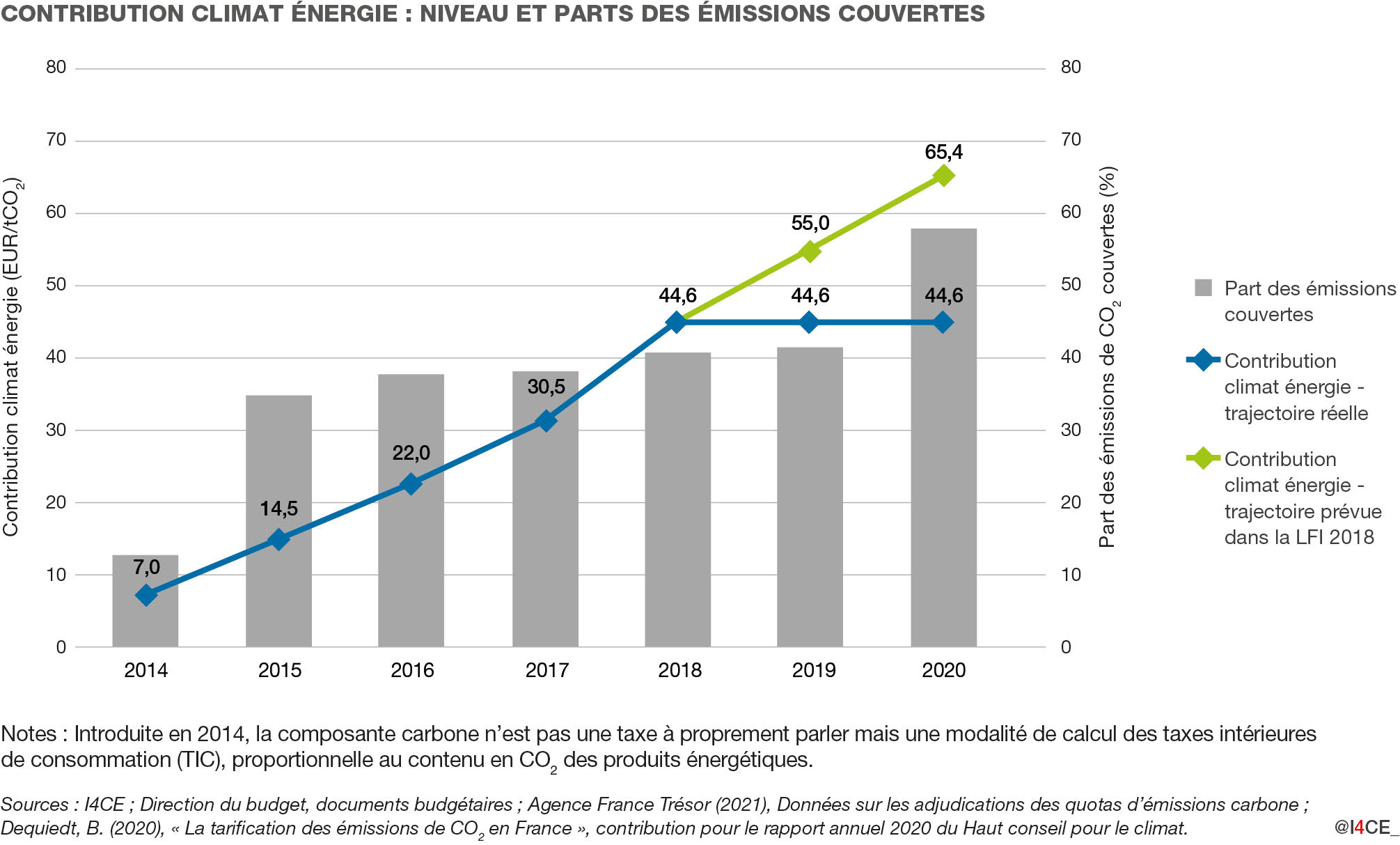 D’un montant initial de 7 euros par tonne de CO2, la contribution climat-énergie a augmenté chaque année pour atteindre 44,60 euros par tonne de CO2 en 2018. La loi de finances pour 2018 prévoyait une augmentation de la contribution climat-énergie à 65,4 €/tCO2 en 2020 et 100 €/tCO2 en 2030 ; en raison de la crise des « gilets jaunes », l’Assemblée Nationale a validé le gel de la contribution climat-énergie à son niveau de 2018 jusqu’en 2022.