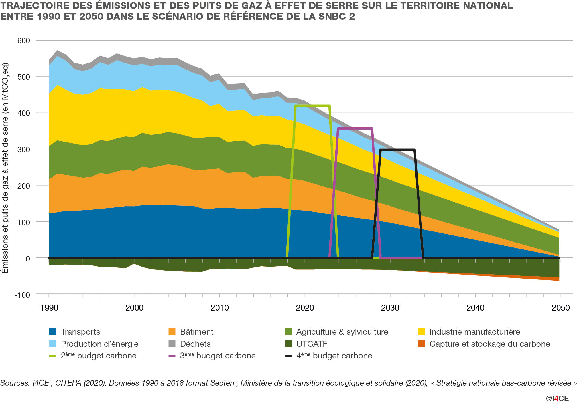 La Stratégie nationale bas-carbone correspond au scénario retenu par le gouvernement pour son action publique. Le scénario privilégié de cette stratégie se veut raisonnable et réaliste. Il se caractérise par un recours mesuré de technologies comme l'hydrogène ou la capture du carbone, une sollicitation raisonnée des leviers de sobriété – sans perte de confort – et par un fort développement de l'efficacité énergétique. À noter que la SNBC prise en compte dans les travaux d’I4CE correspond à celle élaborée entre 2018 et 2020, la nouvelle stratégie étant en cours d’actualisation. Cette nouvelle stratégie devra notamment tenir compte de l’objectif européen adopté en juillet 2021 de réduire les émissions nettes de gaz à effet de serre de 55%.