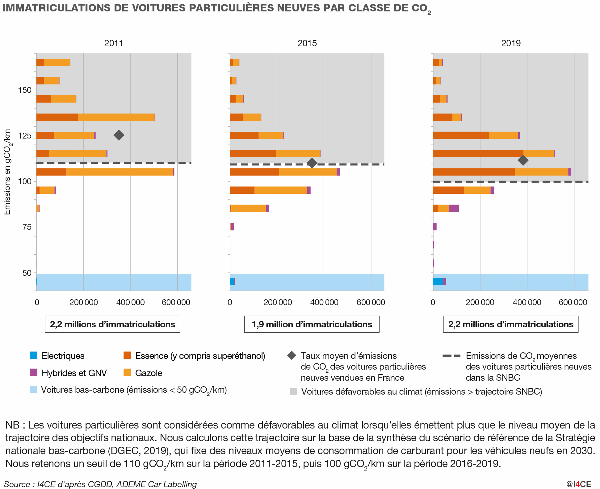 La SNBC, conçue antérieurement aux scénarios de l'ADEME, prévoyait le déploiement rapide d'un grand nombre de petits véhicules électriques légers, ce qui place les besoins d'investissements à proximité du scénario 1 de l'ADEME. Par ailleurs, les véhicules lourds roulant à l'électricité, au GNV et à l'hydrogène progressent dans le segment des poids lourds et des autocars. À l'horizon 2050, ils remplacent presqu'entièrement les modèles diesel qui dominent les ventes aujourd'hui.