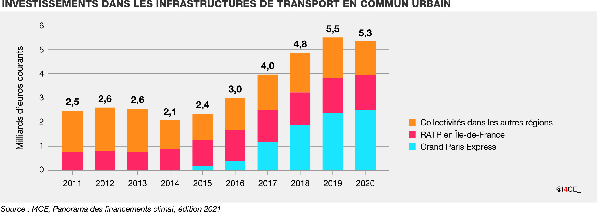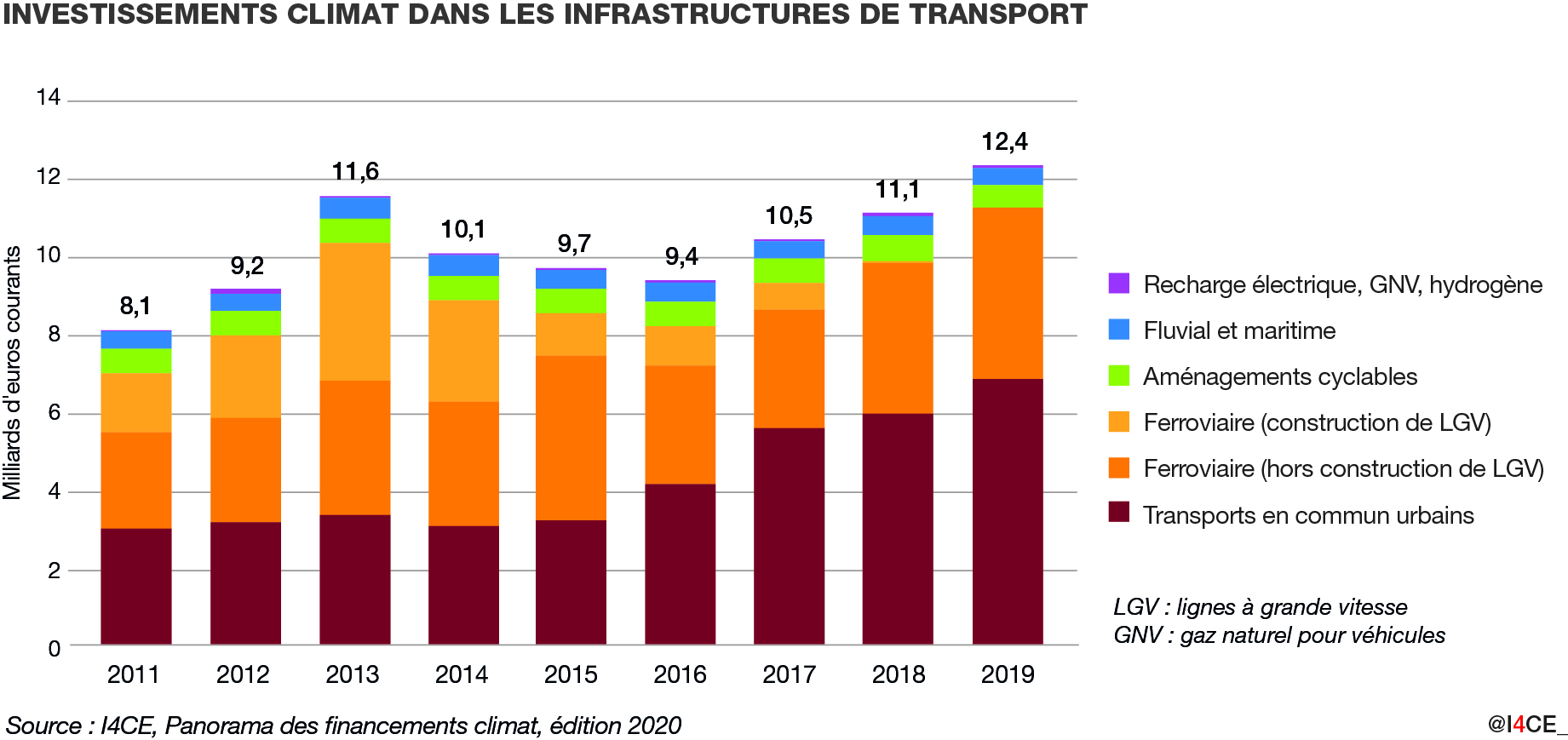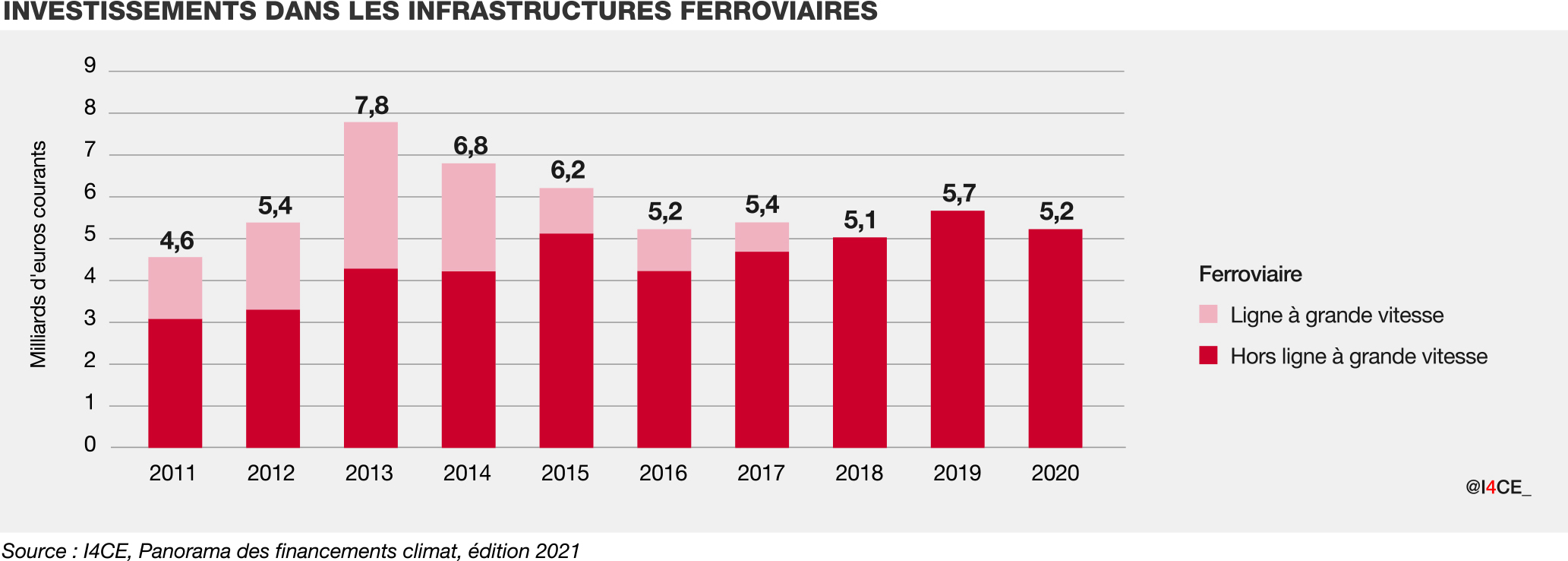 Les investissements dans les infrastructures de report modal sont repartis à la hausse, ils s'élèvent à 12,9 milliards d'euros en 2021. Les investissements dans l'entretien et la modernisation du réseau ferroviaire et des transports en commun ont augmenté, après une année 2020 où les chantiers ont dû être interrompus lors du premier confinement.