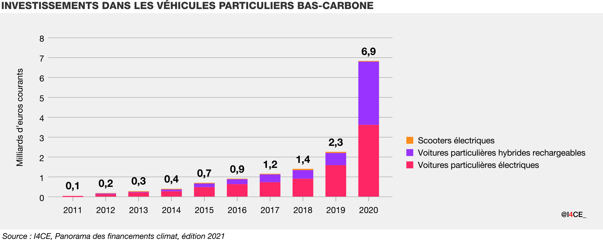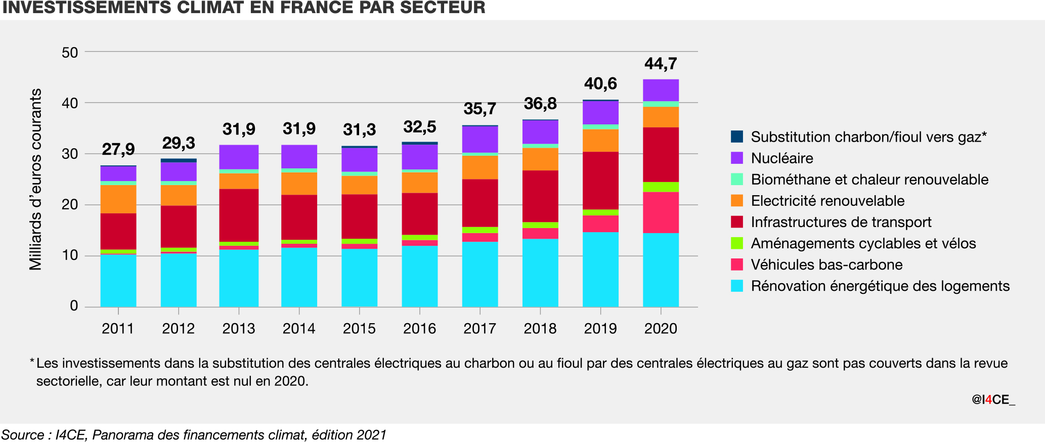 Les investissements climat atteignent 84 milliards d’euros en 2021, soit 18 milliards d'euros de plus qu'en 2020. Ils progressent dans la plupart des secteurs, notamment dans les véhicules bas-carbone, dans les énergies renouvelables, et dans la rénovation énergétique des bâtiments.