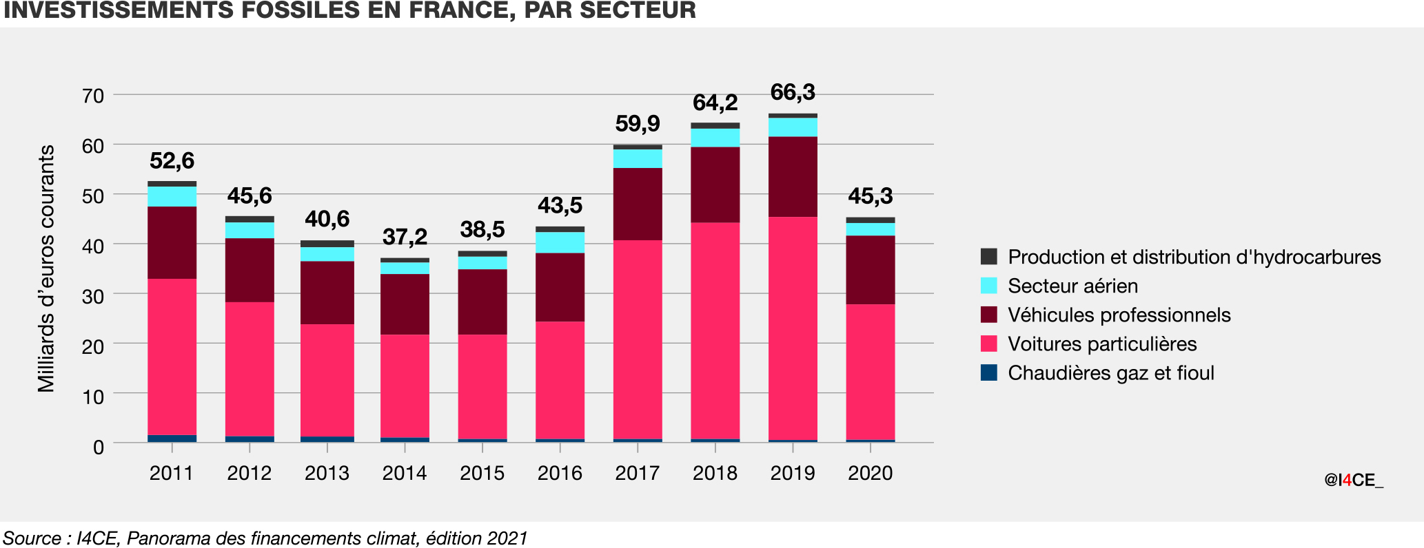 Les investissements fossiles ont fortement diminué depuis la crise sanitaire, et s'élèvent à 62 milliards d'euros en 2021. Ce décrochage s'explique principalement par le recul des immatriculations des véhicules thermiques, provoqué par les difficultés d'approvisionnement en semi-conducteurs mais aussi par des réglementations plus exigeantes sur les émissions des véhicules.