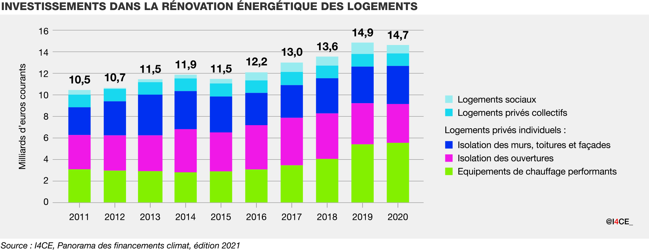 Les investissements ont rebondi et s'élèvent à 19,9 milliards d'euros. De nombreux chantiers avaient été interrompus en 2020 à cause des périodes de restriction sanitaire. Dans le segment des logements privés, ce sont surtout les équipements de chauffage (pompes à chaleur, appareils de chauffage au bois, chaudières gaz à très haute performance) qui tirent les investissements à la hause.