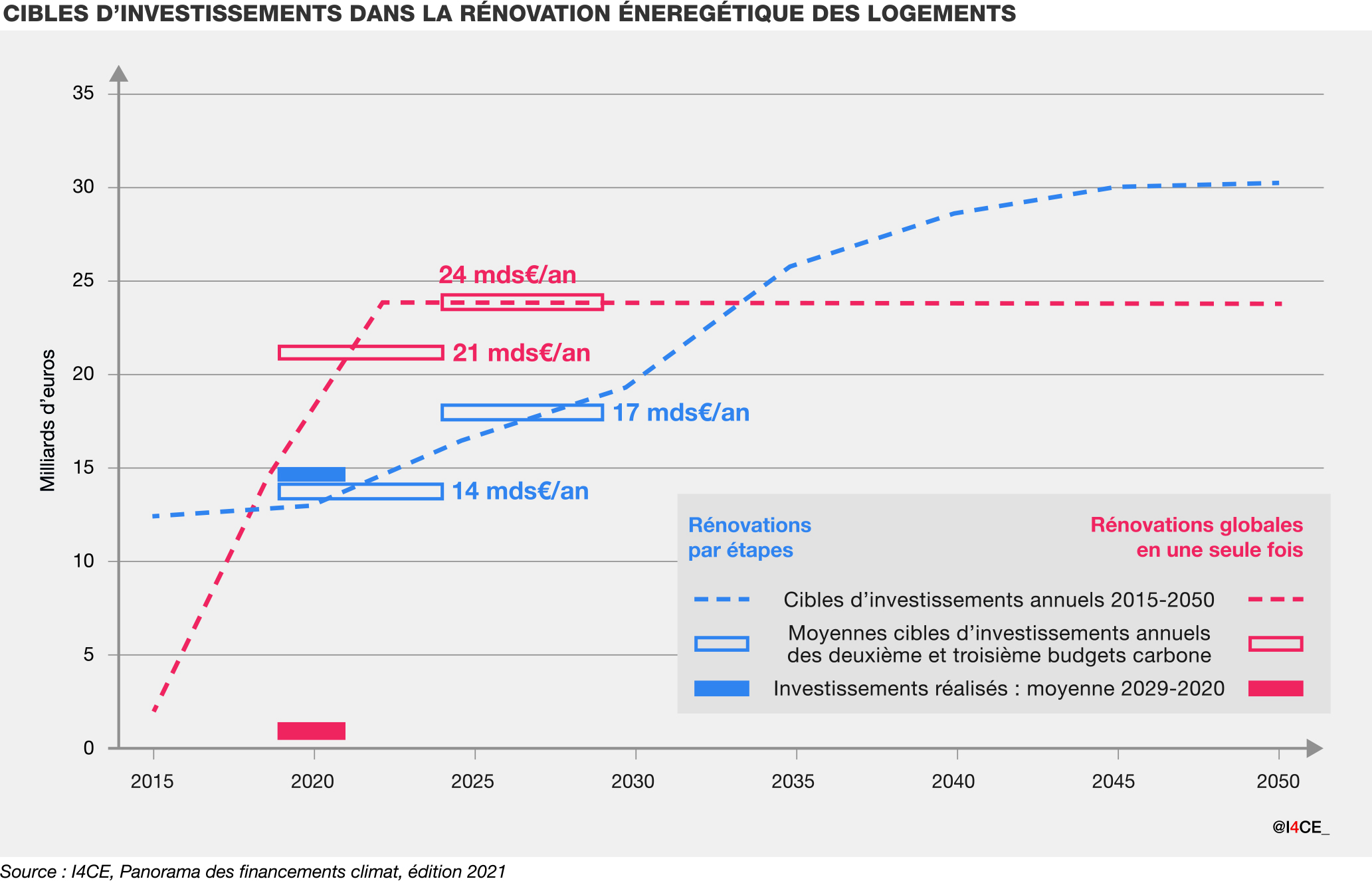 Les investissements dans les travaux de rénovation énergétique des bâtiments ont augmenté de 20% en 2021. Toutefois, très peu des investissements dans la rénovation énergétique des bâtiments donnent lieu à des réductions de consommations d'énergie d'ampleur suffisante. Tandis que la SNBC et les scénarios 1 et 2 de l'ADEME donnent la priorité à la rénovation des logements vers le niveaux « basse consommation » (BBC), les scénarios 3 et 4 envisagent plutôt de poursuivre la pratique actuelle de rénovation par geste. En ce qui concerne le tertiaire, tous les scénarios envisagent de généraliser la règlementation existante.