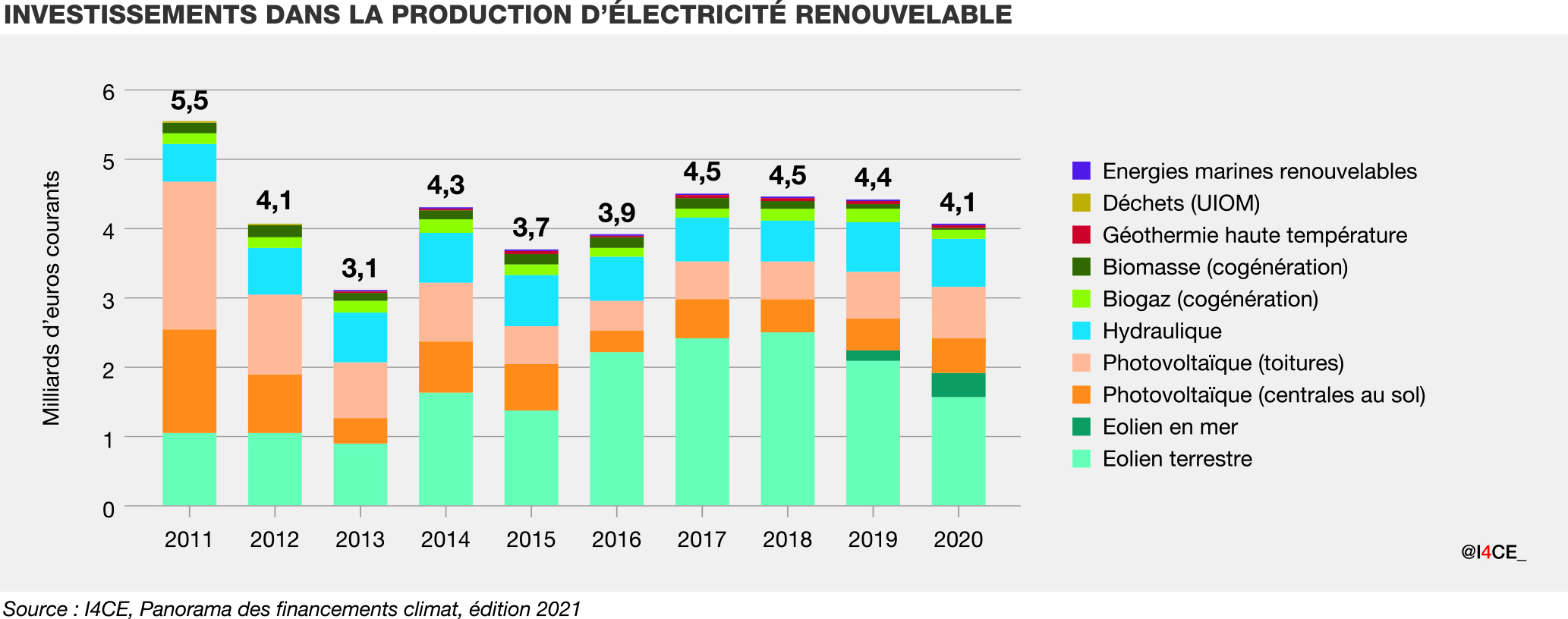 Les investissements s'élèvent à 9,5 milliards d'euros en 2021, soit une progression de 3,2 milliards d'euros par rapport à 2020. Alors qu'ils sont constants dans l'éolien terrestre, ils ont fortement augmenté dans le solaire, l'éolien en mer, l'injection de biométhane et les réseaux de chaleur. Dans l'éolien en mer, les différents chantiers lancés ces deux dernières années montent en puissance et ont mobilisé davantage d'investissements qu'en 2021.