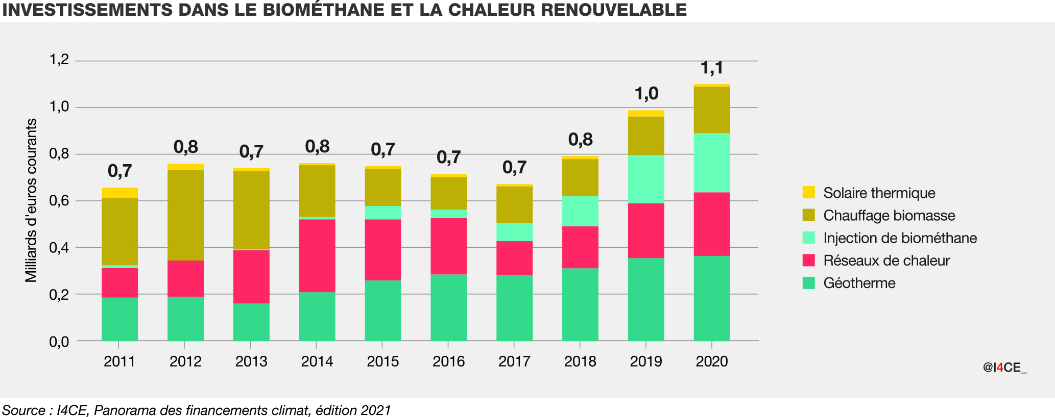 Dans le solaire, bien plus de capacités ont été raccordées en 2021, avec une nette augmentation des installations des grandes centrales solaires au sol. La croissance des investissements dans l'injection de biométhane s'est concentrée dans la méthanisation agricole en 2021. Les projets de création et d'extension des réseaux de chaleur mobilisent plus d'investissements grâce aux aides engagées dans le cadre du Fonds Chaleur de l'ADEME.