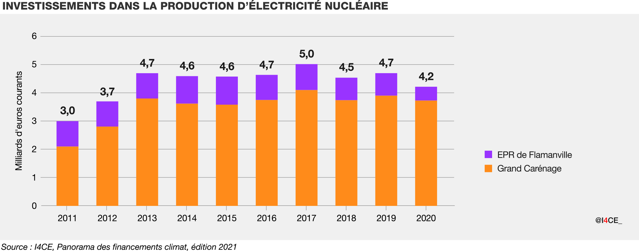 Les investissements sont restés stables, ils s'élèvent à 4,6 milliards d'euros en 2021. Les investissements dans le programme de maintenance du parc nucléaire existant, dit programme du « Grand Carénage » ont légèrement progressé. Quant à l'EPR de Flamanville, les investissements diminuent légèrement en 2021 du fait de sa mise en service prévue au deuxième trimestre 2023.