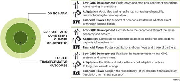 As seen in I4CE’s Alignment Bulls Eye, aligned financial institutions should seek to as a minimum do no harm, and as much as possible support Paris consistent climate co-benefits and foster transformative outcomes.