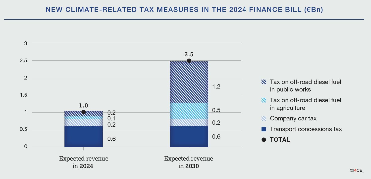 The government’s draft budget also includes a number of tax increases that can be described as environmentally friendly. The French government has made several mentions of raising the solidarity tax on airline tickets, but ultimately this has not been included in the bill submitted to Parliament. The bill does, however, provide for the reduction and elimination of certain tax concessions on non-road diesel by 2030, which currently benefit agriculture and public works companies. This measure, which also serves as an incentive, is not expected to generate any new revenue to balance the budget: the affected sectors benefit from compensatory measures which, moreover, seem to do little or nothing to encourage the transition. The increase in taxation on company cars, which should contribute to the greening of the fleet, will not support the financing of new transition expenditure, since this revenue is allocated to the social security system. New revenue to finance the transition is instead expected to come from the “tax on the large-scale operation of long-distance transport infrastructure”, which should generate around €600 million.