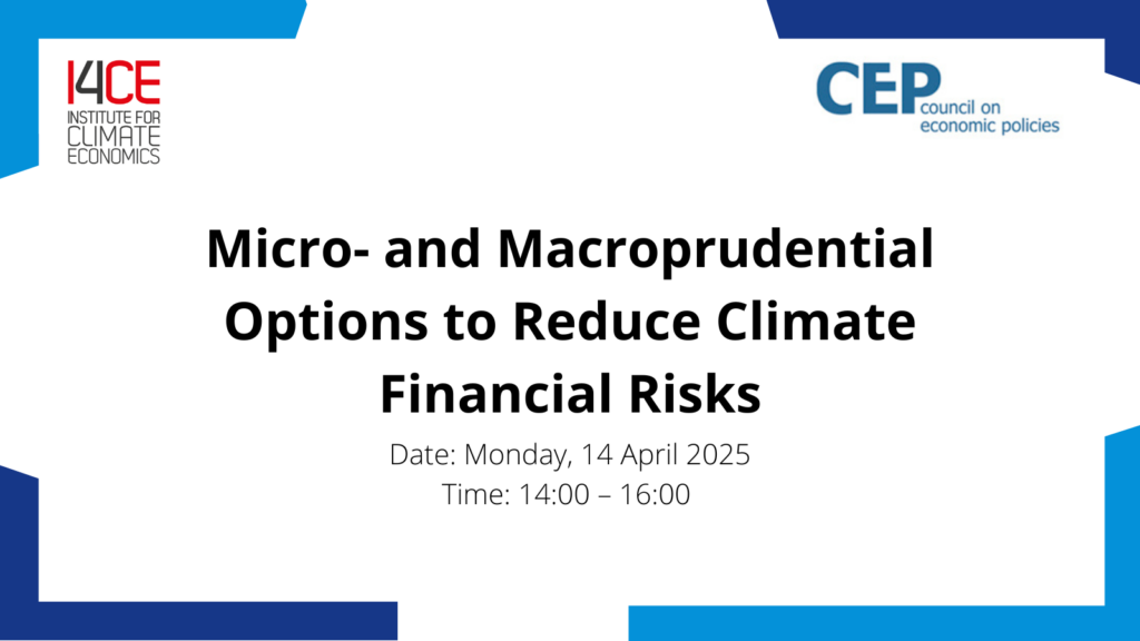 The Institute for Climate Economics (I4CE) and the Council on Economic Policies (CEP) co-hosted a virtual roundtable on micro- and macroprudential policy instruments to address climate financial risks. The event brought together policymakers, academics, and other stakeholders to discuss options for financial regulators and supervisors to proactively manage climate risks in the European banking sector.