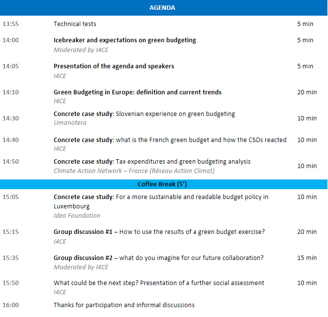 Specifically, in this event, 4 organizations (Umanotera – Slovenia, CAN-France, IDEA Foundation – Luxembourg and I4CE – France) shared their best practices, and national challenges in supporting the move towards a greener national budget.