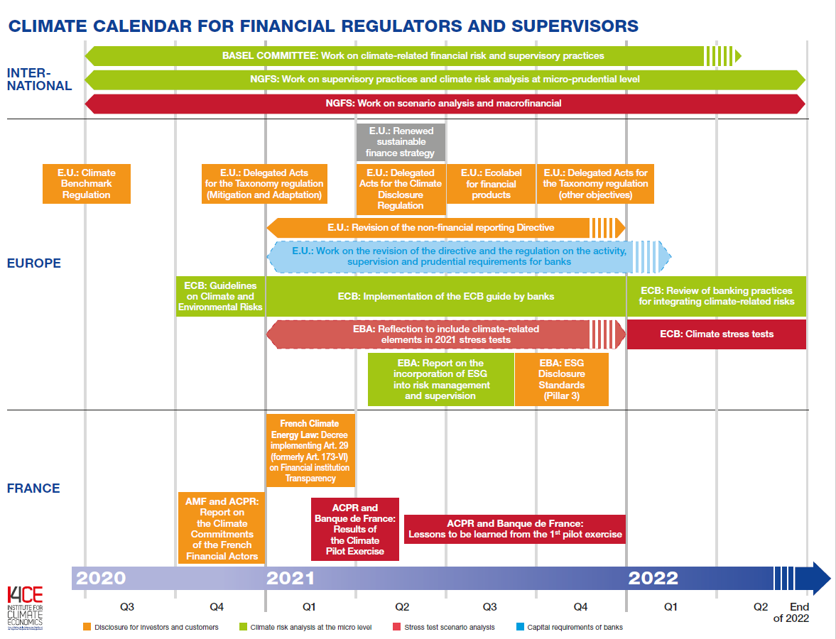 The public institutions that regulate and supervise private finance will talk a lot about climate change in the coming months. The European taxonomy that allows economic actors to identify activities that are favorable to ecological transition or the “climate stress tests” of the Banque de France and ACPR are just some of the issues that we invite you to follow. I4CE has synthesized for you the “climate calendar” of financial regulation in a graphics.