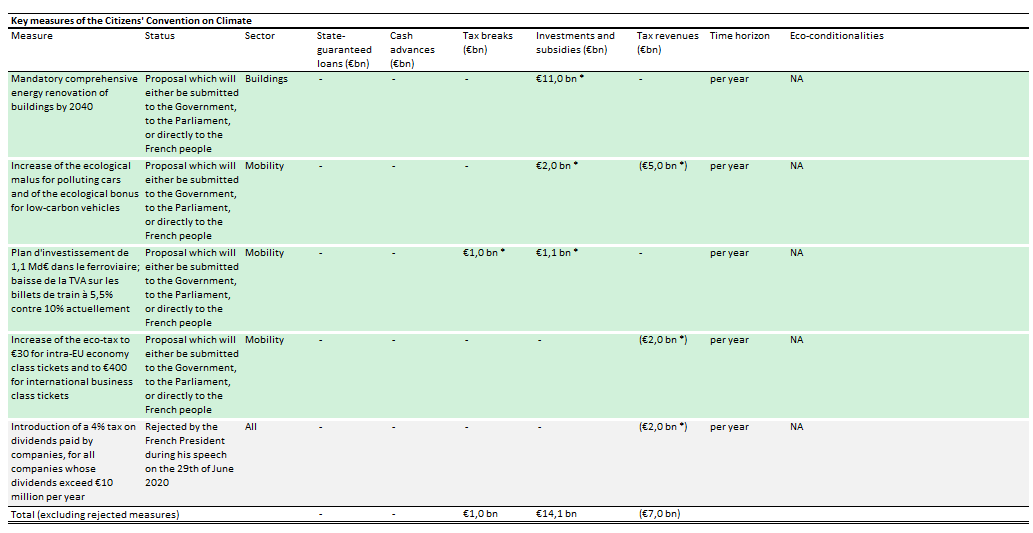 Table : Follow-up on the announcements of the Citizen’s Climate Convention with a significant impact on public finances