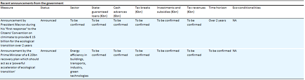 - This table lists only the support measures for highly emitting sectors or for key sectors of the energy transition. It does not cover other sectoral recovery plans which may have an indirect impact on emissions.