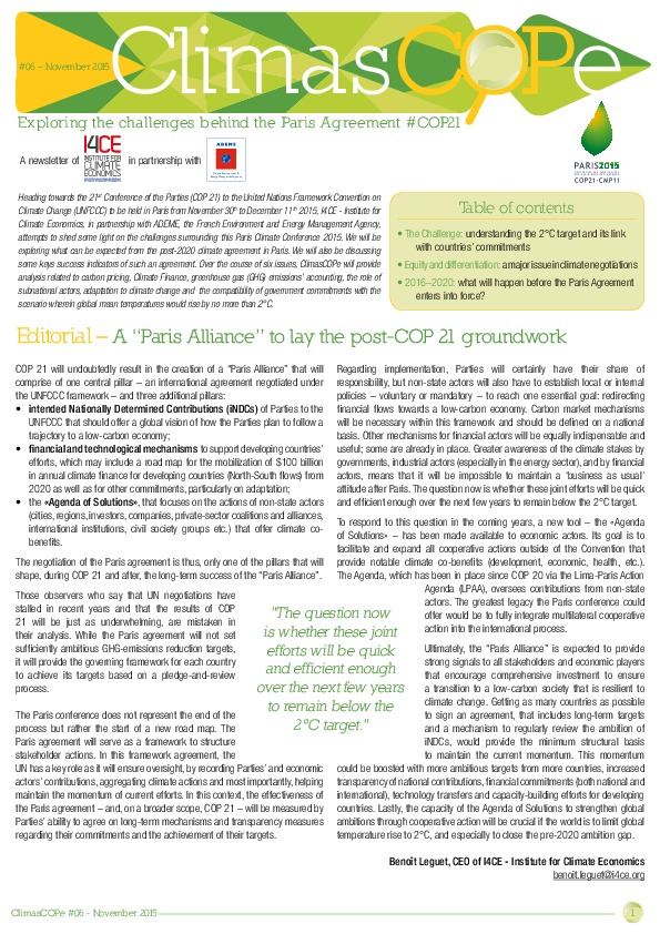 For our sixth and final issue of ClimasCOPe, we would like to provide you with a short-publication that includes four key topics to consider on the eve of COP 21. The issue starts with an editorial titled “A Paris Alliance to lay the post-COP 21 groundwork” by Benoît Leguet. Then our experts attempt the delicate endeavour of deciphering the link between countries’ commitments and the 2°C target. Our experts then go further to examine the issue of equity and differentiation to better understand the differentiated responsibilities of countries. Last but not the least, we have also taken into account the 2016-2020 period to better evaluate means to strengthen pre-2020 ambition through cooperative action by all economic actors (State and non-state actors).