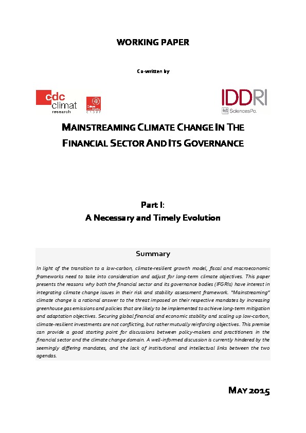 In light of the transition to a low-carbon, climate-resilient growth model, fiscal and macroeconomic frameworks need to take into consideration and adjust for long-term climate objectives. This paper presents the reasons why both the financial sector and its governance bodies (IFGRIs) have interest in integrating climate change issues in their risk and stability assessment framework. “Mainstreaming” climate change is a rational answer to the threat imposed on their respective mandates by increasing greenhouse gas emissions and policies that are likely to be implemented to achieve long-term mitigation and adaptation objectives. Securing global financial and economic stability and scaling up low-carbon, climate-resilient investments are not conflicting, but rather mutually reinforcing objectives. This premise can provide a good starting point for discussions between policy-makers and practitioners in the financial sector and the climate change domain. A well-informed discussion is currently hindered by the seemingly differing mandates, and the lack of institutional and intellectual links between the two agendas.