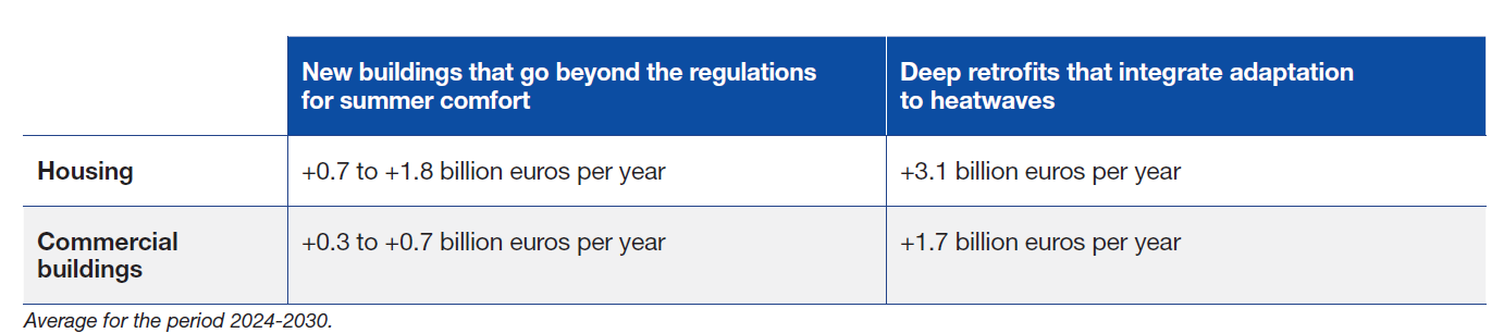 To address the growing impacts of heatwaves on economic activities and populations, the adaptation of the building sector is becoming a new imperative. While the question of “how” to adapt has been the subject of numerous studies, the question of “how much” has so far received little attention. To move forward on this issue, we present in this report: