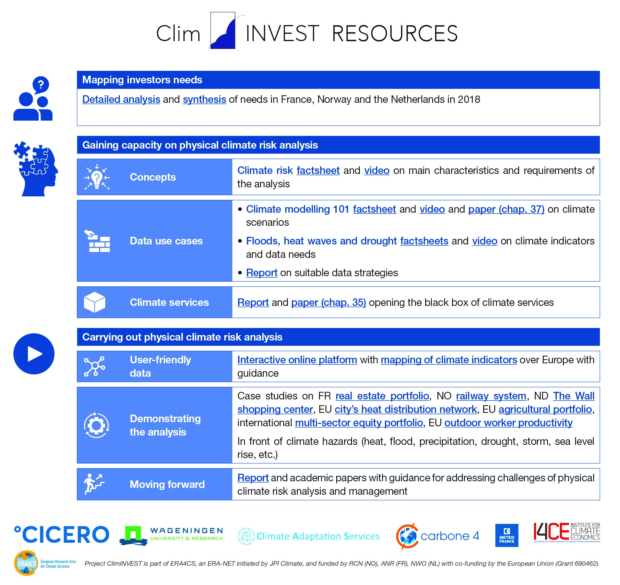 There is still much work to do though. The report summarizes priority action points based on feedbacks from twelve financial institutions involved in the project and from the research partners. Financial actors should build further expertise on physical climate risks and experiment climate risk assessment on their own portfolios. To do so, they can capitalize on the publicly available ClimINVEST resources listed on the figure below. Mobilizing not only financial actors but also a broader range of stakeholders will also be a key determinant for quick progress on physical climate risks in finance. Regulators, supervisors, scientists, service providers, municipalities, etc. all have a role to play.