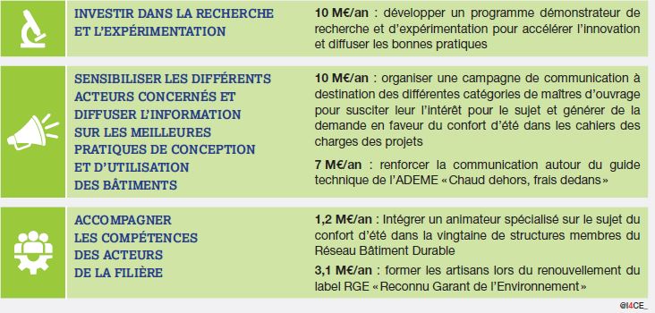 - Systematically take climate change into account in public real estate projects. The French government, local authorities and public agencies could immediately include summer comfort criteria in the specifications for their own real estate projects – particularly when they concern sensitive public buildings and uses (e.g. school buildings, social housing, etc.) – that go beyond actual thermal regulations. For example, in the case of teaching and research buildings, this would represent an additional annual investment effort of around €500 million/year on a current investment estimated at €4.9 billion/year.