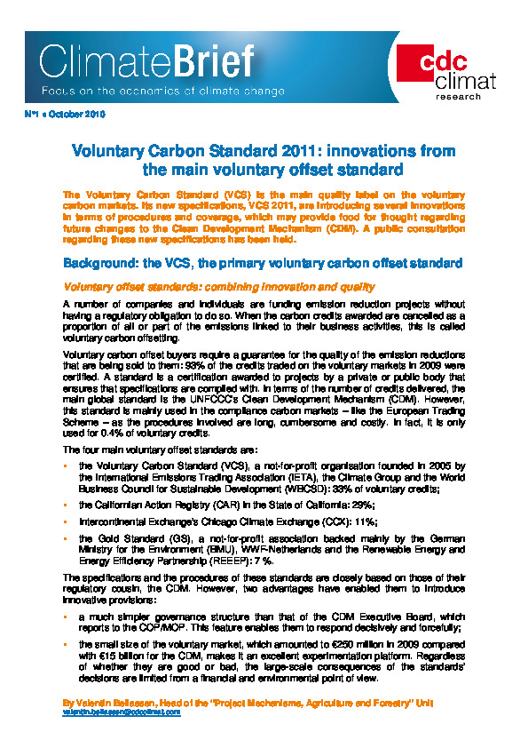 The Voluntary Carbon Standard (VCS) is the main quality label on the voluntary carbon markets. Its new specifications, VCS 2011, are introducing several innovations in terms of procedures and coverage, which may provide food for thought regarding future changes to the Clean Development Mechanism (CDM). A public consultation regarding these new specifications has been held.