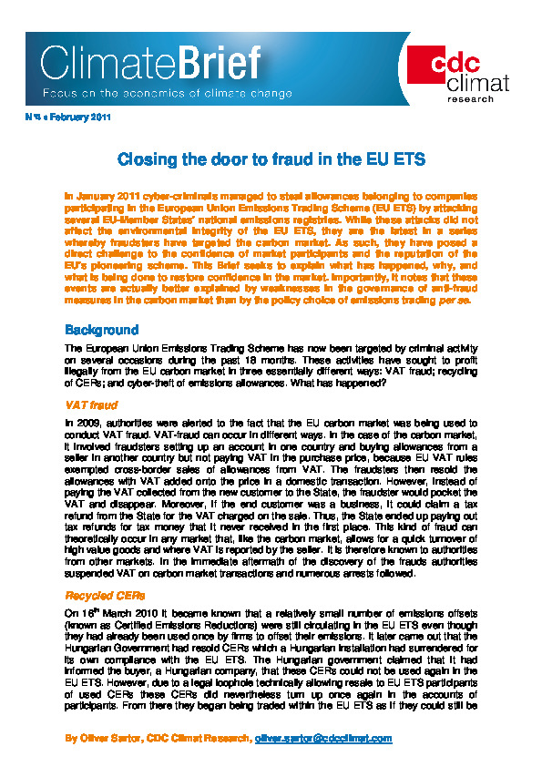 In January 2011 cyber-criminals managed to steal allowances belonging to companies participating in the European Union Emissions Trading Scheme (EU ETS) by attacking several EU-Member States’ national emissions registries. While these attacks did not affect  the  environmental  integrity  of  the  EU  ETS,  they  are  the  latest  in  a  series whereby  fraudsters  have  targeted  the  carbon  market. As  such,  they  have  posed  a direct  challenge  to  the  confidence  of  market  participants  and  the  reputation  of  the EU’s  pioneering  scheme.  This  Brief  seeks  to  explain what  has  happened,  why,  and what is being done to restore confidence in the market. Importantly, it notes that these events  are  actually  better  explained  by  weaknesses  in  the  governance  of  anti-fraud measures in the carbon market than by the policy choice of emissions trading per se.