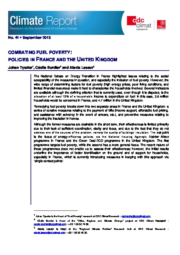 The National Debate on Energy Transition in France highlighted issues relating to the social acceptability of the measures in question, and especially the inclusion of fuel poverty. However, the wide range of determining factors for fuel poverty (high energy prices, poor living conditions, and limited financial resources) make it hard to characterise the households involved. Several indicators are available although the defining criterion that is currently used, even though it is disputed, is the allocation of at least 10% of a household’s income to expenditure on fuel: in this case, 3.8 million households would be concerned in France, and 4.7 million in the United Kingdom.