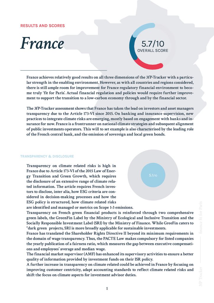 France was amongst the first to integrate climate consideration in its financial market regulation. With Article 173 of the French Energy Transition Law, France set a new global benchmark in 2015 and developed public green labels. Public bodies have taken up climate considerations as well, e.g. Banque de France has published the climate exposure of its own portfolios, sovereign Green bonds have been issued and the government provides a clear transition pathway within a Strategic plan. Highlights of the current update of country assessment include