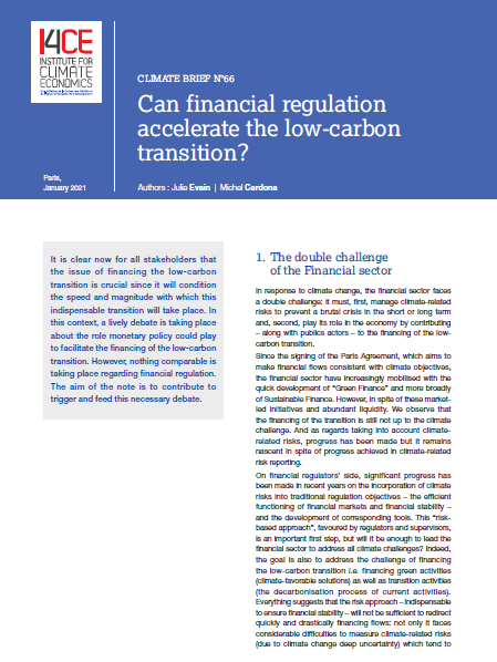 An increasing number of NGOs and researchers are calling on financial regulators to go beyond their traditional objectives in order to contribute to financing the low-carbon transition. In the European and North American countries, the debate on this issue is highly polarised, with regulators and supervisors tending to be against it, especially where prudential regulation is concerned. But before disagreeing on the principle, it is important to look at whether financial regulation can truly contribute to financing the low-carbon transition and to examine the regulatory changes that would be necessary. I4CE has thus explored the specific actions that regulators could implement in order to accelerate the financing of the low-carbon transition. To do so, the authors took as their starting point the real obstacles to this financing observed “in the field”. To inform this analysis, more than 20 interviews were conducted with business leaders, researchers, financial actors and French and European regulators.