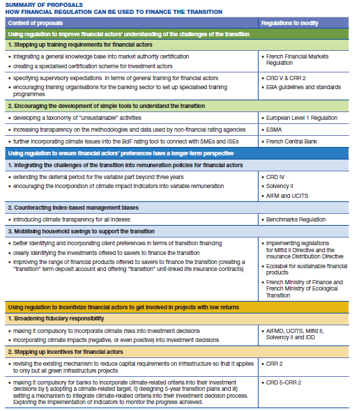 For each of these areas, the authors propose several avenues for regulators to explore. To enhance financial actors’ understanding of climate issues, they thus propose for example making changes to Autorité des Marchés Financiers (Financial Markets Regulator) certification for market actors and including training in supervision expectations. They also propose incorporating climate impact criteria into the variable remuneration of financial actors to ensure they have a longer term perspective; or encouraging them to get involved in projects with low returns by explicitly incorporating climate criteria into the concept of fiduciary responsibility, or by using prudential regulation to integrate climate criteria into the financial decisions of banks.