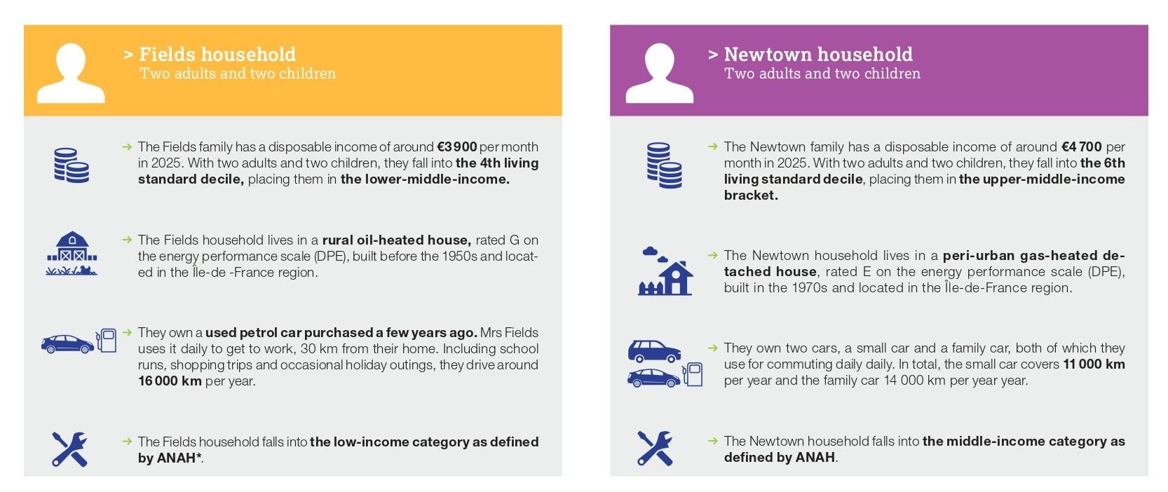 To assess the economic capacity of households to invest in the transition, we focus on two household profiles: the Fields family and the Newtown family. These two households share certain characteristics: they belong to the middle-income bracket (defined here as households whose standard of living falls between the third and eighth deciles), they live in a single-family house that they own and are still paying off through a mortgage, they rely on a car for everyday travel, and they have two children. They differ in other respects: income level, area of residence, housing characteristics, and mobility habits (see boxes).