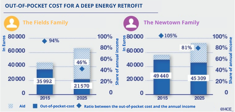 The Newtown household has also seen some improvement since 2015, but their situation in 2025 is less favourable than that of the Fields household. The financial aid they can obtain for retrofitting their home is lower, since they are in a different ANAH (National Housing Agency) income category and their property has different characteristics. They have sufficient borrowing capacity to cover the out-of-pocket costs with a loan, but energy savings do not fully cover their loan repayments, even when using their savings to reduce the loan amount. However, the net increase in their budget remains modest (around €20 per month), which seems manageable, especially since a deep energy retrofit improves comfort and protects the household from potential future energy price hikes.