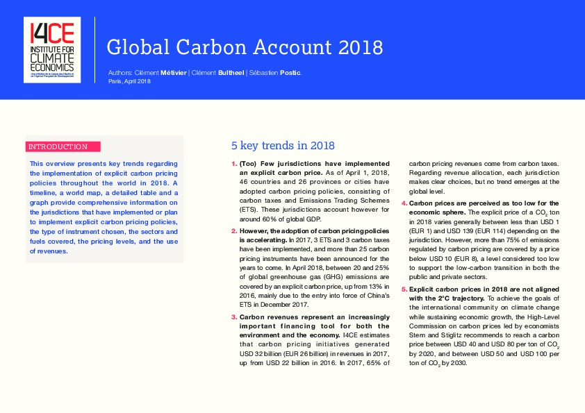 I4CE‘s Global Carbon Account 2018 presents key trends regarding the implementation of explicit carbon pricing policies throughout the world in 2018.