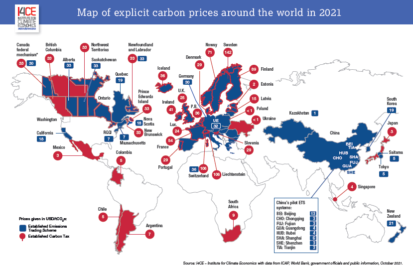 1. As of October 1st, 2021, 47 jurisdictions (countries, provinces, or cities) are operating a carbon pricing scheme (carbon tax and/or an Emissions Trading System (ETS)). Together, they account for around 60% of global gross domestic product (GDP). Over the past year, two G20 countries have implemented an explicit price on carbon: China and Germany.