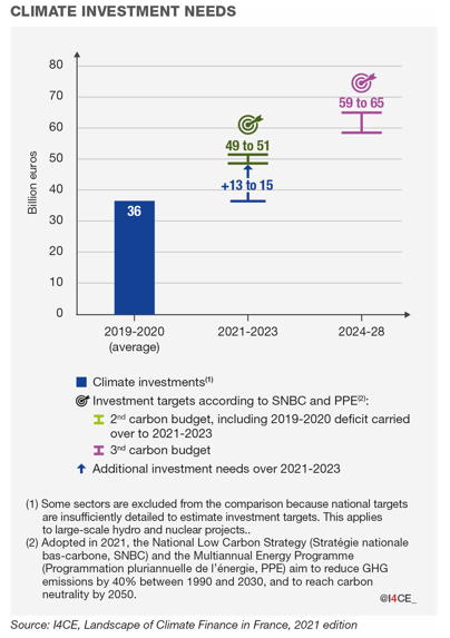 Despite having withstood the health crisis, climate investment remains insufficient to meet national targets by the end of 2020. An additional 13 to 15 billion in public and private investments are needed each year until 2023, with about double that amount required until 2028. This is a minimum target, as many sectors, such as agriculture, industry and nuclear power are not covered, and the new European objective implies more rapid action by 2030 to reduce GHG emissions by 55% compared to 1990 levels (currently at 40%).