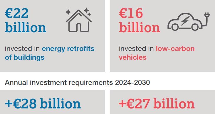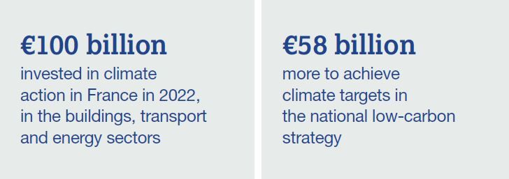 Further investments are needed, however, to significantly reduce greenhouse gas emissions. The draft scenario of the French national low-carbon strategy (Stratégie nationale bas-carbone, SNBC) gives a first insight into climate investment needs. Compared with 2022, each year between 2024 and 2030 an additional €58 billion will be needed to meet climate investment targets. The needs are concentrated in retrofitting of buildings, electric vehicles and railways.