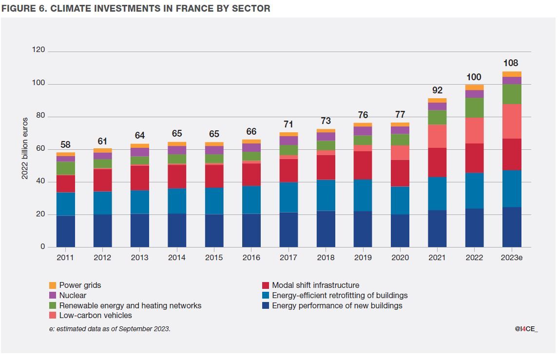 I4CE‘s Landscape of Climate Finance is an overview of climate investments made by households, companies and public authorities. Such investments include retrofitting buildings, purchasing electric vehicles, installing renewable energy, as well as paying for rail, cycling and urban public transport infrastructure.
