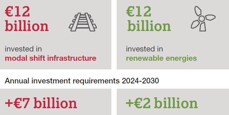 Investment in low-carbon vehicles, particularly electric vehicles, is growing rapidly, reaching €16 billion in 2022, driven by the momentum created by the European regulations that entered into force in 2020, as well as by national subsidies and regulations. The extended range of batteries and the growing density of the recharging network are contributing to the rise of electric vehicles purchases. However, demand for electric light and heavy goods vehicles is still low. The gradual electrification of all segments would lead to additional investment of €27 billion per year between 2024 and 2030.