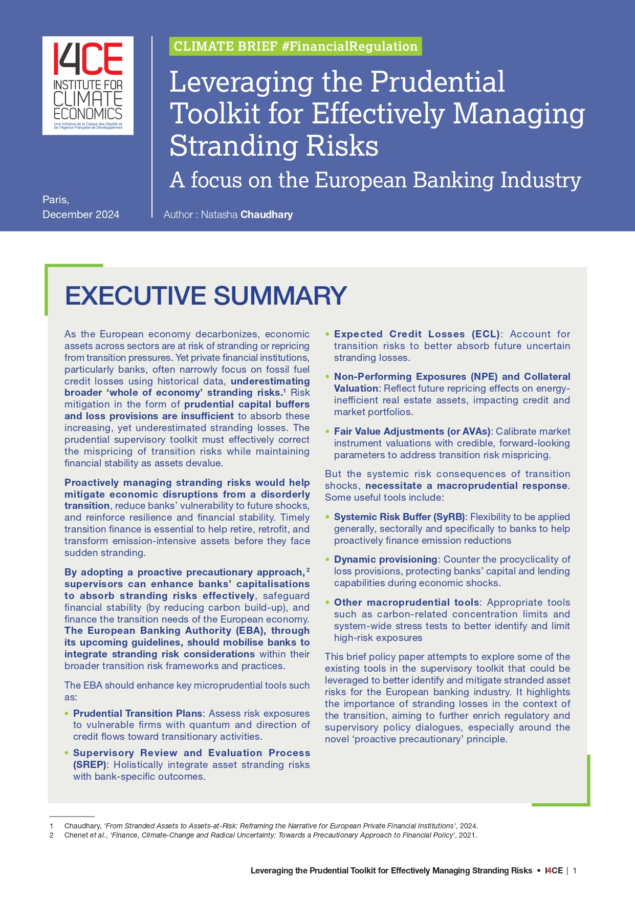 This brief policy paper attempts to explore some of the existing tools in the supervisory toolkit that could be leveraged to better identify and mitigate stranded asset risks for the European banking industry. It highlights the importance of stranding losses in the context of the transition, aiming to further enrich regulatory and supervisory policy dialogues, especially around the novel ‘proactive precautionary’ principle.