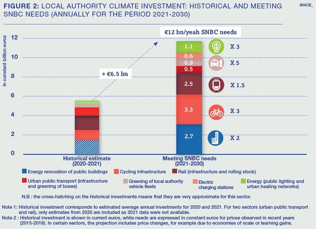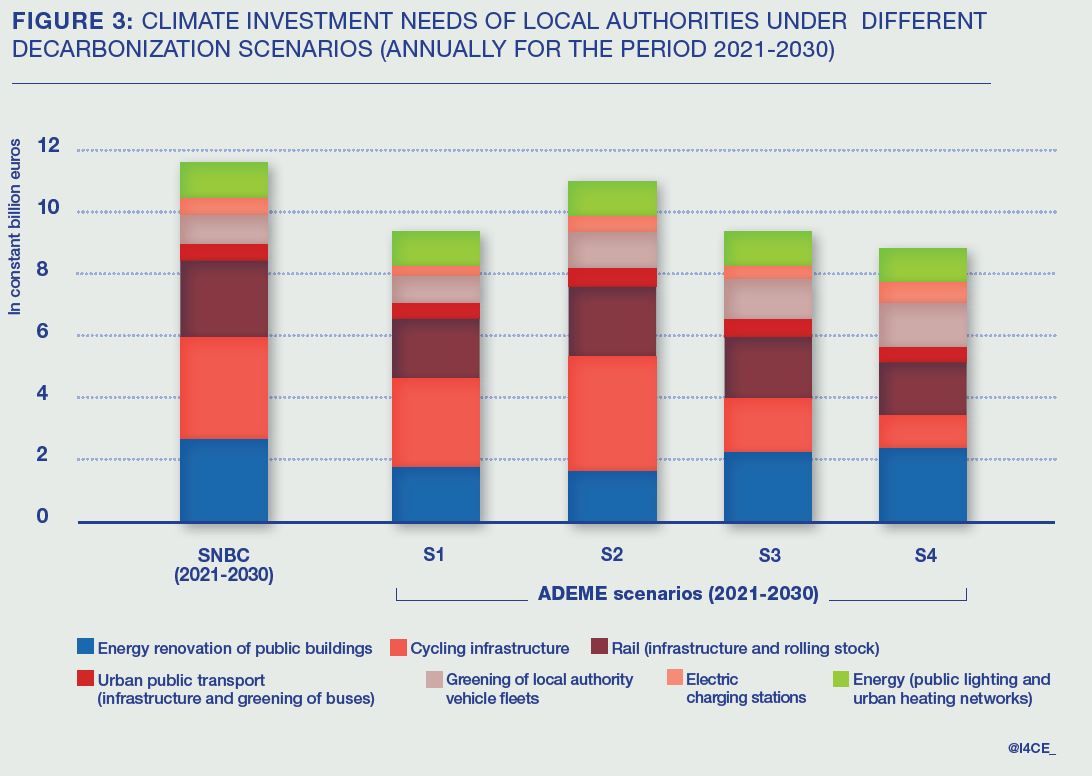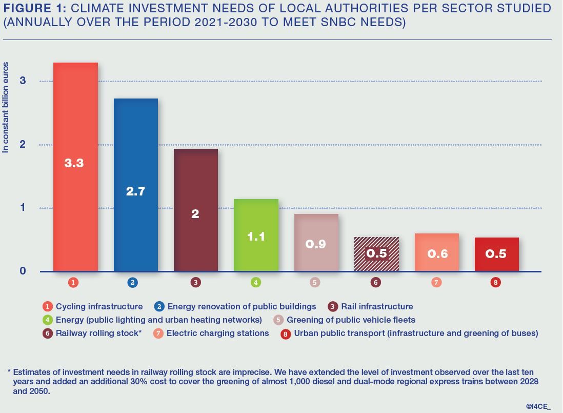 I4CE estimates that local authorities would need to invest at least €12 billion annually until 2030 to meet the SNBC targets, which represents 18% of their current total investment budget.