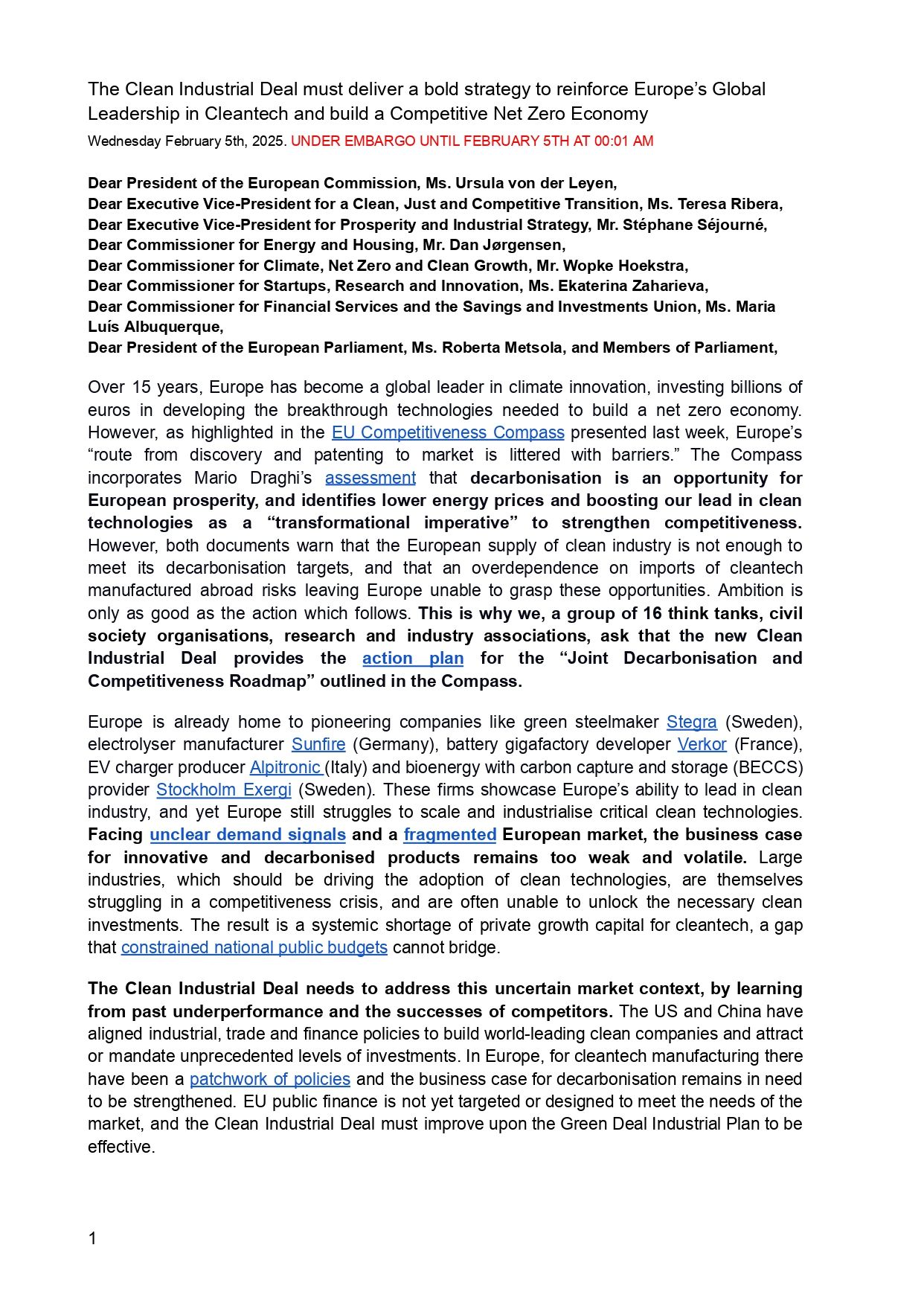 Open letter: The Clean Industrial Deal must deliver a bold strategy to reinforce Europe’s Global Leadership in Cleantech and build a Competitive Net Zero Economy