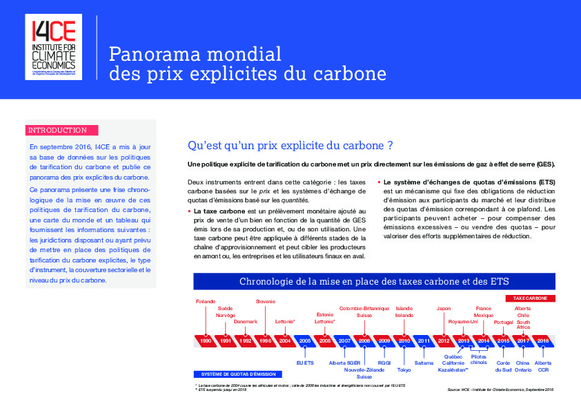 In September 2016, I4CE updated its database on carbon pricing policies and published a panorama of explicit carbon pricing policies.