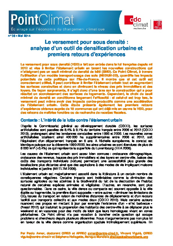 Le versement pour sous densité (VSD) a fait son entrée dans la loi française depuis mi 2012 et vise à limiter l’étalement urbain en taxant les nouvelles constructions qui n’atteignent pas un seuil minimal de densité de bâti (SMD). Ce Point Climat, à travers l’utilisation d’un modèle transport-usage des sols (NEDUM-2D), quantifie les impacts potentiels de cette politique sur l’Ile-de-France. Il montre que si cet outil est correctement utilisé, il peut contribuer à limiter l’étalement urbain tout en augmentant les surfaces construites et donc en diminuant le niveau des prix immobiliers et des loyers. De façon surprenante, il s’agit donc d’une taxe sur la construction qui a pour résultat un accroissement des surfaces de logements. Cependant, le choix du seuil minimal de densité en conditionne largement l’efficacité : si celui-ci est trop bas, le versement peut même avoir des impacts contre-productifs comme une accélération de l’étalement urbain. Cette étude présente également les premiers retours d’expérience obtenus auprès de 19 communes qui ont déjà mis en oeuvre le VSD, pour des raisons de maîtrise foncière ou de recherche de recettes fiscales.