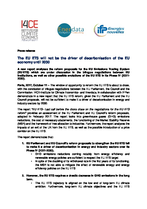 Press Release: EU ETS – Last call before the doors close onthe negotiations for the post-2020 reform Download