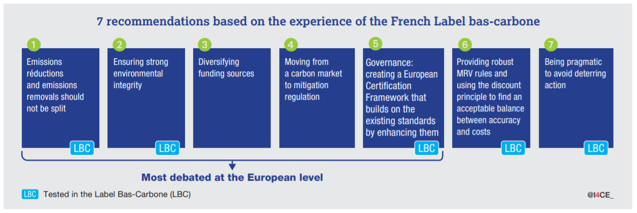 We propose 7 recommendations, inspired by both our concrete experience with the French Label Bas-Carbone to which I4CE has contributed, and by 15 years of research on carbon certification. These 7 recommendations have been chosen based on the topics most debated at the European level (recommendations 1 to 5) and the innovations proposed and tested in the French Label Bas-Carbone (recommendations 2, 6 and 7).