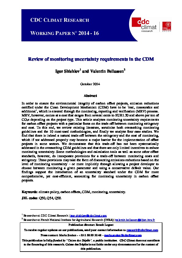 In order to ensure the environmental integrity of carbon offset projects, emission reductions certified under the Clean Development Mechanism (CDM) have to be ‘real, measurable and additional’, which is ensured through the monitoring, reporting and verification (MRV) process. MRV, however, comes at a cost that ranges from several cents to EUR1.20 and above per ton of CO2e depending on the project type. This article analyzes monitoring uncertainty requirements for carbon offset projects with a particular focus on the trade-off between monitoring stringency and cost. To this end, we review existing literature, scrutinize both overarching monitoring guidelines and the 10 most-used methodologies, and finally we analyze four case studies. We find that there is indeed a natural trade-off between the stringency and the cost of monitoring, which if not addressed properly may become a major barrier for the implementation of offset projects in some sectors. We demonstrate that this trade-off has not been systematically addressed in the overarching CDM guidelines and that there are only limited incentives to reduce monitoring uncertainty. Some methodologies and calculation tools as well as some other offset standards, however, do incorporate provisions for a trade-off between monitoring costs and stringency. These provisions may take the form of discounting emissions reductions based on the level of monitoring uncertainty – or more implicitly through allowing a project developer to choose between monitoring a given parameter and using a conservative default value. Our findings support the introduction of an uncertainty standard under the CDM for more comprehensive, yet cost-efficient, accounting for monitoring uncertainty in carbon offset projects.