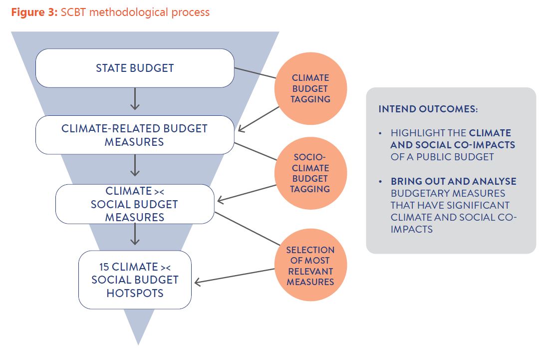 I4CE has developed a tool to help policymakers identify climate policies in their national budgets with likely social co-benefits: the Social Climate Budget Tagging (SCBT). Based on Climate Budget Tagging (CBT) methodologies which are increasingly used by Ministries of Finance worldwide, the SCBT highlights the likely social effects of climate-related budgetary measures. It allows users to identify climate policies to which more public resources should be dedicated – those with likely positive social effects -, and budget measures with positive or negative climate effects as well as with likely negative social effects. These measures should typically be removed, diminished, or individuals should be compensated for their effects.