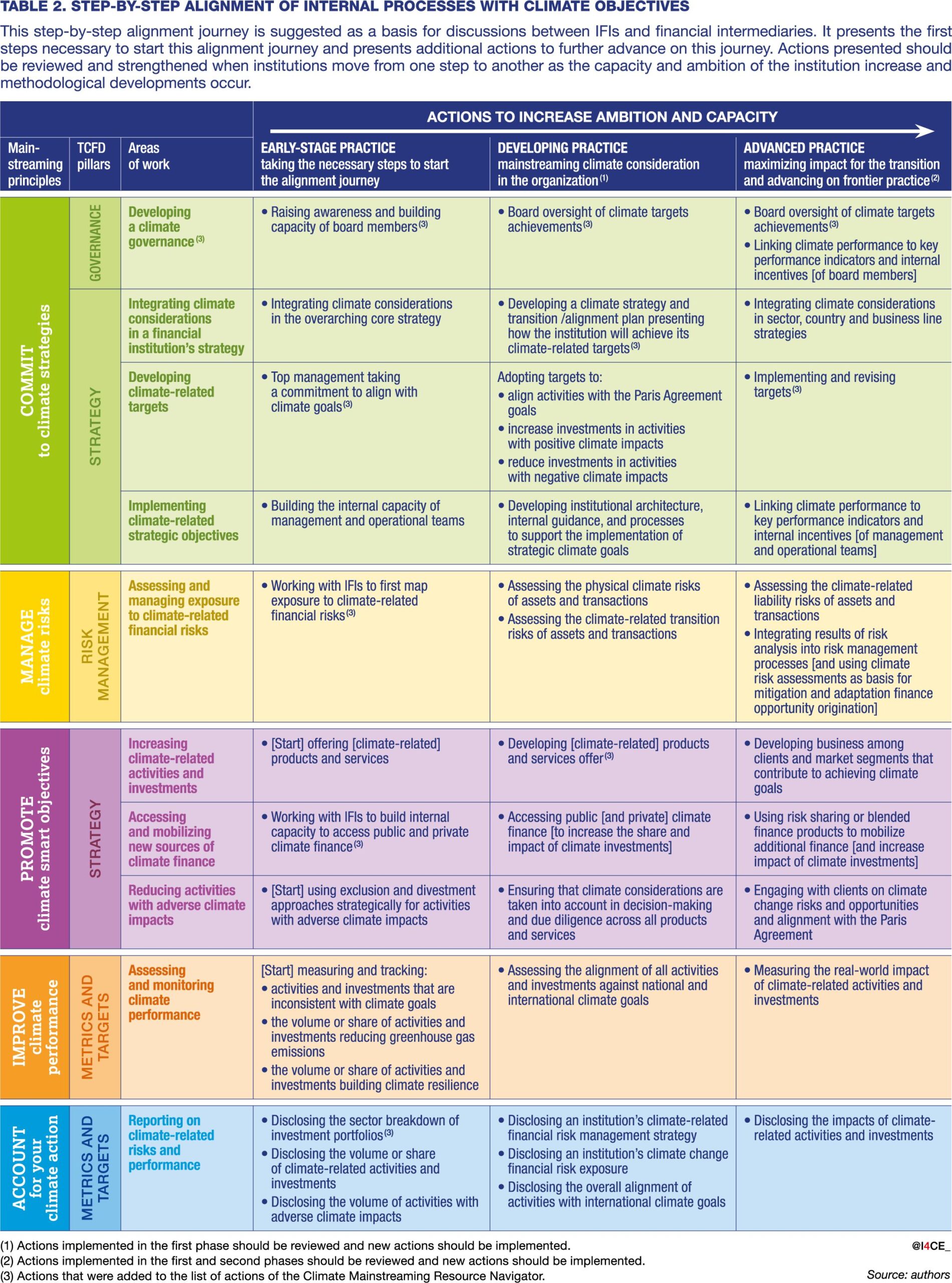 IFIs have the expertise to provide guidance on how to align internal processes with the Paris Agreement objectives over time. To develop comprehensive guidance, IFIs should rely on existing and upcoming international standards such as recommendations of the Task Force on Climate-related Financial Disclosures (TCFD) or guidance on transition plans as well as guiding frameworks from voluntary initiatives on climate mainstreaming. Authors of the report suggest, on that basis, a principle-based step-by-step alignment journey for financial intermediaries.