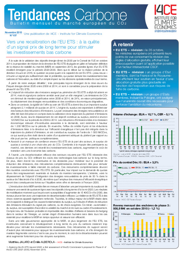 With the endorsement of energy and climate targets by the EU Council in October 2014, the proposal for a revised EU Emissions Trading Scheme (EU ETS) directive disclosed in July and the enforcement of the Market Stability Reserve (MSR) in September2015, a recalibrated EU ETS is emerging for the 2020 to 2030 period. While the debate will be unfolding in 2016 around the final EU ETS directive, the question arises whether the EU ETS will be able to convey a long term price signal to 2030 which could drive investments and innovations, beyond beyond merely impacting short term operational decisions.