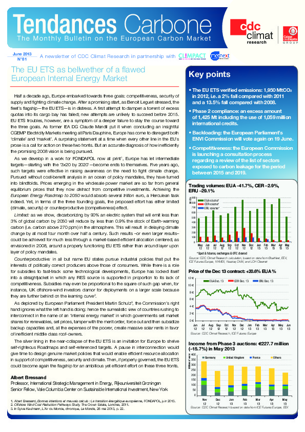 The EU ETS verified emissions: 1,950 MtCO2 in 2012, i.e. a 2% fall compared with 2011 and a 13.5% fall compared with 2008. Phase 2 compliance: an excess amount of 1,425 Mt including the use of 1,059 million international credits.